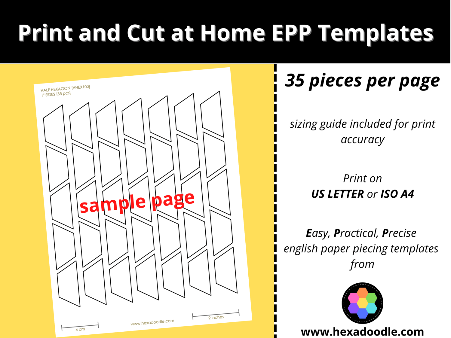 FHHEX100 - FLAT HALF HEXAGON - EPP Print and Cut at Home templates - 1 inch sides for printing and cutting out at home. 35 flat half hexagons per page.