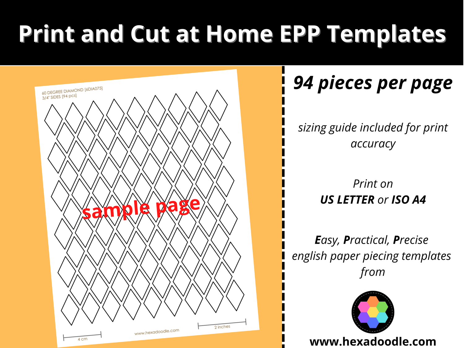 6DIA075 - 60° DEGREE DIAMOND - EPP Print and Cut at Home templates - ¾ inch sides for printing and cutting out at home. 94 diamonds per page.