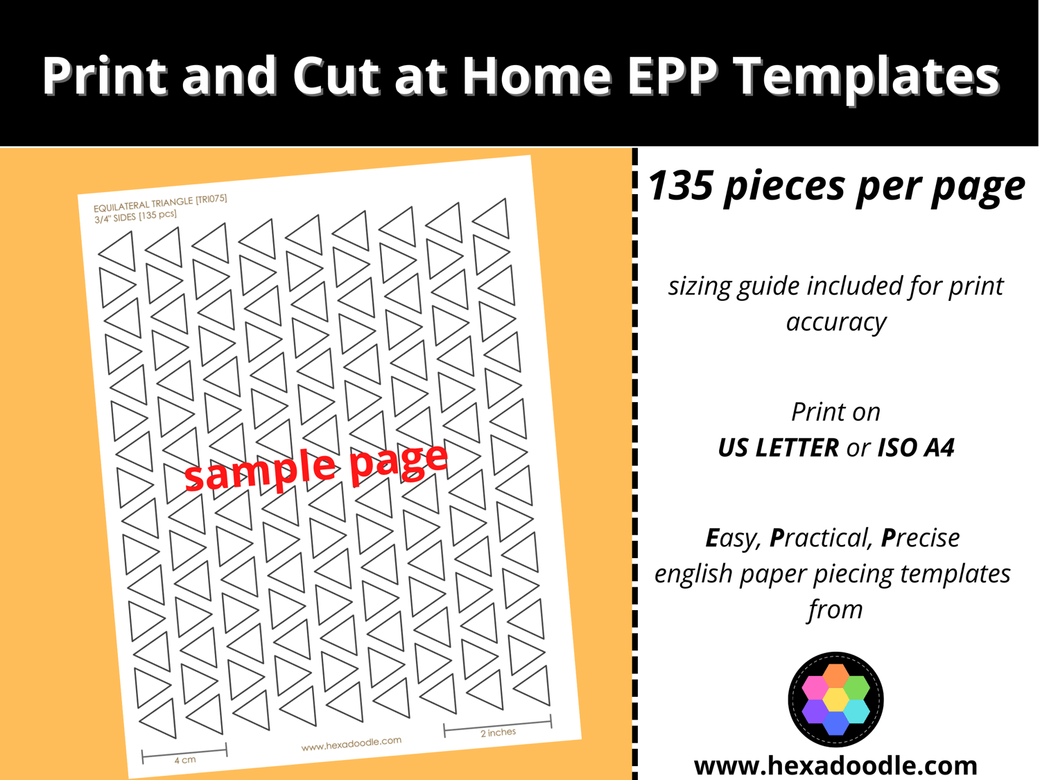 TRI075 - EQUILATERAL TRIANGLE - EPP Print and Cut at Home templates - ¾ inch sides for printing and cutting out at home. 135 equilateral triangles per page.